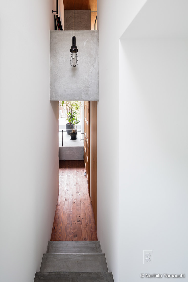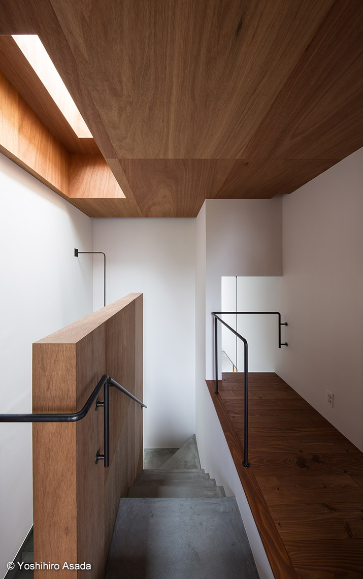 wall. It is beautifully themed with sight switching, different ceiling heights, and shade and shadow created by natural light. The hall that is located at the center of the building with different floor levels plays a role of a hub which connects with each space. It also incorporates plumbing equipment, a counter, and a staircase that are necessary for living, and is connected to an approach from the courtyard, thus not only providing functional comfort but also displaying scenic beauty.