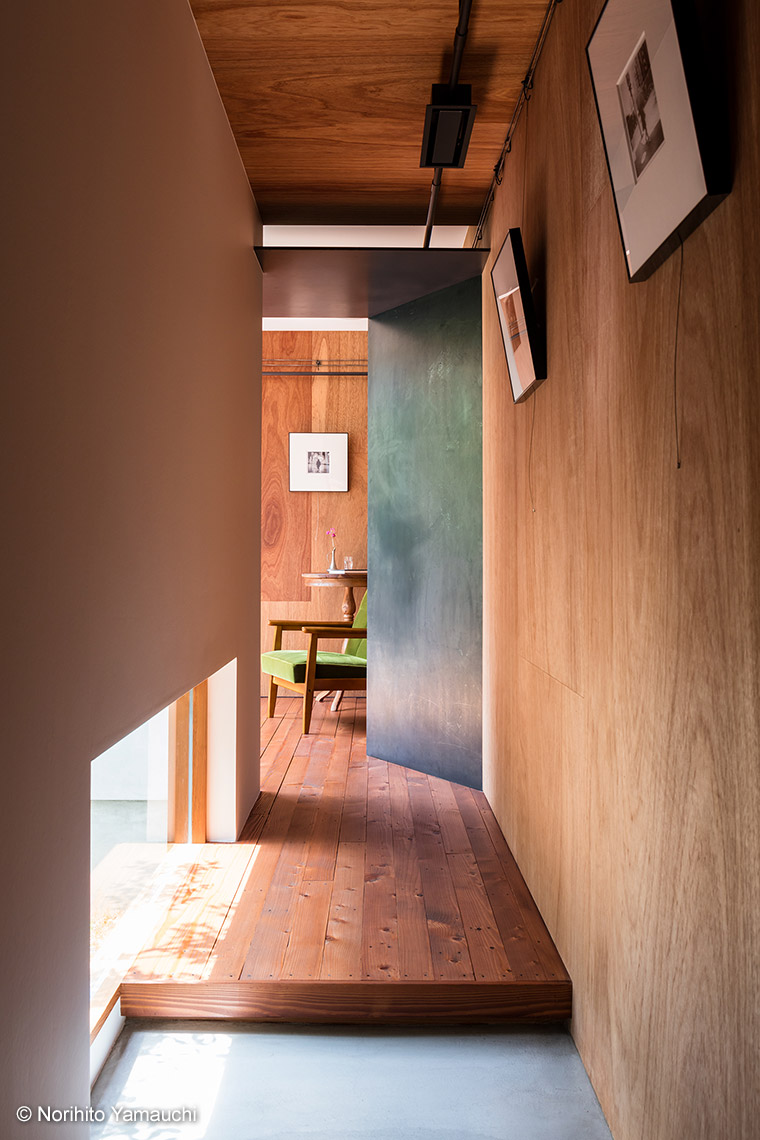 ギャラリーを巡る路地のような細長い通路空間は、アートや写真を壁に飾ることの出来るスペースとしても利用され、単なる移動空間ではない機能を備え持っている。視線の切り返し、天井高さの変化、自然光が創り出す陰影によって通路空間は美しく演出される。建物中央に位置し、フロアレベル差のあるホールは、各スペースを結ぶ八ブ空間になっている。暮らすための必要な水回り、カウンター、階段が配されており、かつ中庭からのアプローチと繋がる構成は、機能面からの快適性に加えて美しい場面を演出する。